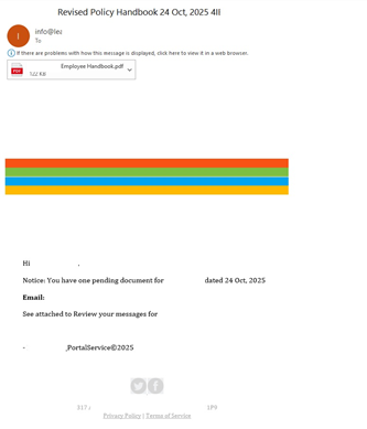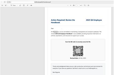 - Falsas notificaciones de RR. HH. que instan a los empleados a revisar o firmar documentos, como calendarios de vacaciones, o incluso a consultar listas de personal despedido, dirigiéndolos finalmente a sitios de robo de credenciales.