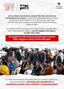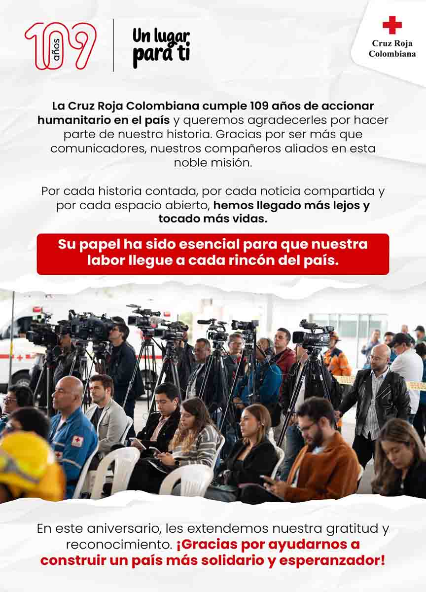 En este nuevo año de servicio a la humanidad, la Cruz Roja Colombiana reafirma su compromiso inquebrantable y sigue extendiendo su mano solidaria a todos aquellos que lo necesiten. La misión es proteger la dignidad y aliviar el sufrimiento humano en cualquier circunstancia, sin discriminación. Juntos, lograremos esta misión y construiremos un camino de esperanza y paz para Colombia, forjando un futuro más justo y humano para todos.
