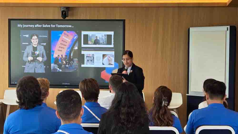 Ella compartió su experiencia en el desarrollo de MyVision, un dispositivo de asistencia inteligente diseñado para ayudar a las personas con deficiencias visuales congénitas. Basándose en su propia experiencia con discapacidad visual, Ramneek describió cómo Solve for Tomorrow le ayudó a crecer y esbozó sus esfuerzos en curso para ampliar su sueño a oportunidades educativas y profesionales más amplias para otras personas con retos similares.