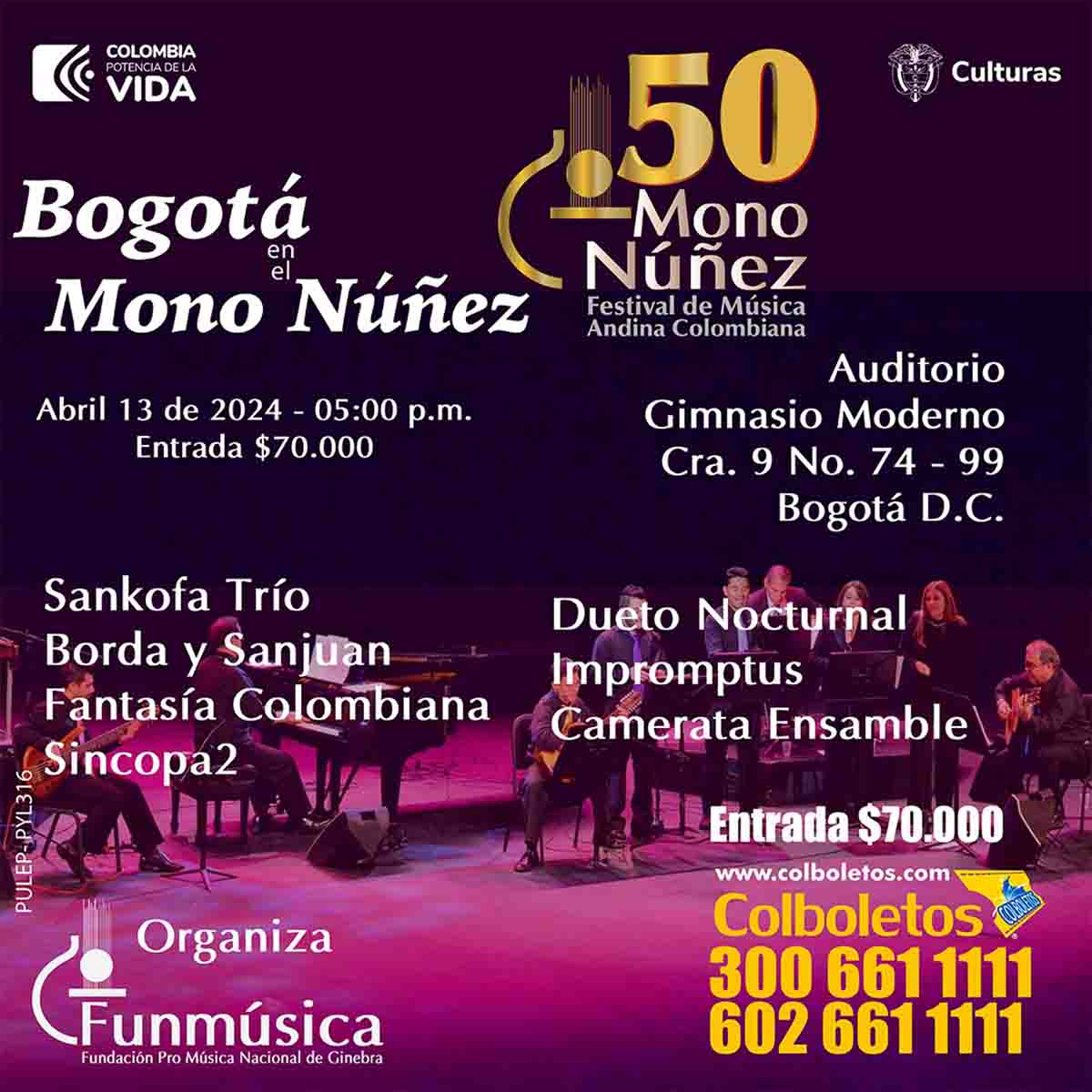 Bernardo Mejía, director ejecutivo de Funmúsica, la organización gestora del Festival, expresó: “Este concierto en el Gimnasio Moderno de Bogotá es mucho más que un evento musical; es un homenaje a la rica historia de la música andina colombiana y un tributo al legado del Festival Mono Núñez. Estamos emocionados de reunir a algunas de las agrupaciones más destacadas de nuestro país en un escenario tan emblemático. Será una noche llena de emociones, nostalgia y, sobre todo, música excepcional que resonará en los corazones de todos los asistentes”.