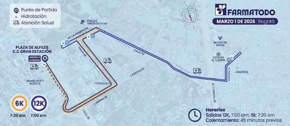 El evento se realizará el próximo 1 de marzo de 2026, con recorridos de 6K y 12K diseñados para corredores principiantes, aficionados y deportistas experimentados. La carrera tendrá como punto de salida y llegada la Plaza de Alfiles del Centro Comercial Gran Estación, con un recorrido que incluirá tramos por Avenida La Esmeralda, Calle 44, Carrera 50, Calle 26, Calle 53, Avenida Carrera 30 y el sector Galerías, entre otras vías principales de la ciudad.