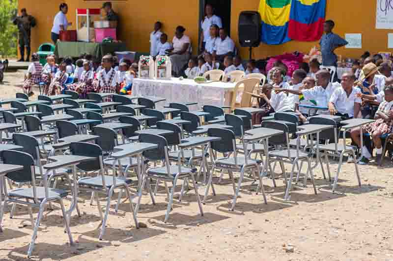 Según el Observatorio de Conflictividad Social de la Defensoría del Pueblo, el 66% de los problemas en el ámbito educativo se deben a infraestructuras deficientes, principalmente por escasez de fondos. Para enfrentar esta situación en 2023, la compañía inició este proyecto emblemático que transformó toneladas de residuos plásticos, provenientes de cartuchos de tinta y tóner de países de Latinoamérica, en 600 sillas escolares. Estas fueron distribuidas en más de cinco instituciones educativas en zonas rurales de los departamentos del Chocó, Amazonas y La Guajira, brindando a los estudiantes un entorno más adecuado para su aprendizaje.