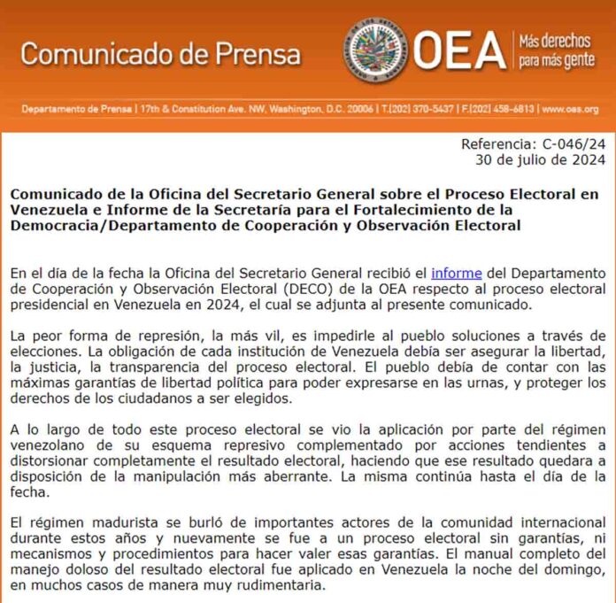 En el día de la fecha, la Oficina del Secretario General de la Organización de los Estados Americanos (OEA) recibió el informe del Departamento de Cooperación y Observación Electoral (DECO) respecto al proceso electoral presidencial en Venezuela en 2024. Este informe, adjunto al presente comunicado, detalla las irregularidades y violaciones a los derechos democráticos que caracterizaron estas elecciones. La OEA ha subrayado que la peor forma de represión es impedirle al pueblo soluciones a través de elecciones, y ha señalado la obligación de cada institución venezolana de asegurar la libertad, la justicia y la transparencia del proceso electoral. Las palabras clave para este artículo incluyen “elecciones presidenciales en Venezuela 2024”, “informe de la OEA”, y “proceso electoral venezolano”.