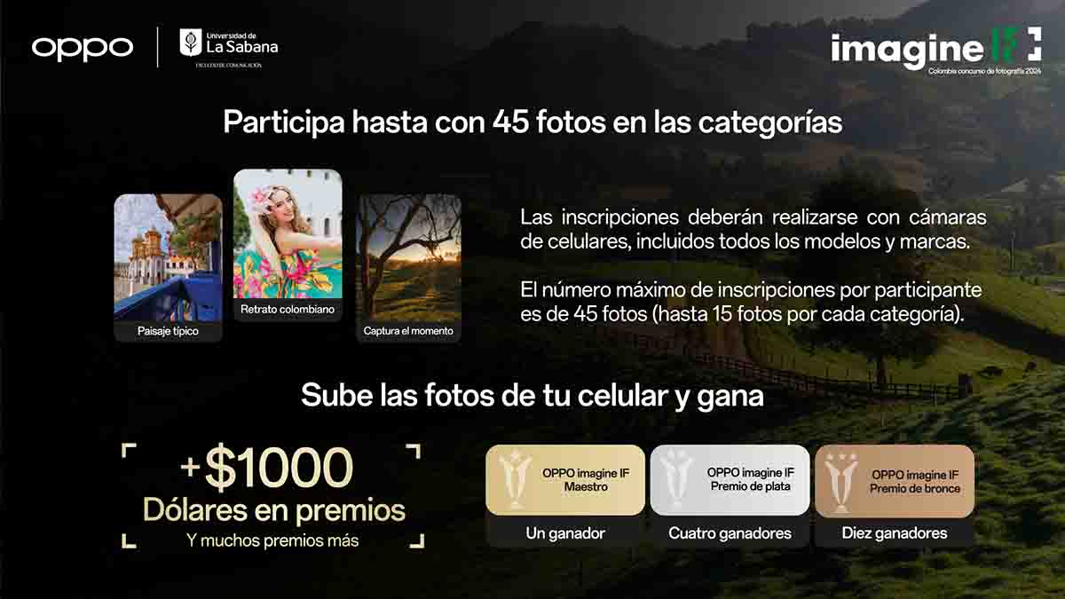 El proceso de participación es sencillo: los interesados deben registrarse y crear una cuenta en la plataforma del concurso, donde podrán subir hasta cinco fotos por categoría. Es importante seguir a OPPO en Instagram @oppocolombia para ser elegible en el concurso. Las fotos pueden ser capturadas con cualquier teléfono móvil, sin importar la marca o modelo, y no deben ser alteradas de manera significativa, permitiéndose solo ajustes básicos como brillo, contraste y saturación.