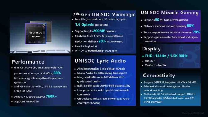 El UNISOC T9300 es compatible con 5G Dual-SIM Dual-Standby y Android 16, e integra el motor de imagen UNISOC Vivimagic de 7.ª generación, con soporte para cámaras de 200 MP, pantallas de alta frecuencia de 144 Hz y audio con calidad Hi-Fi.