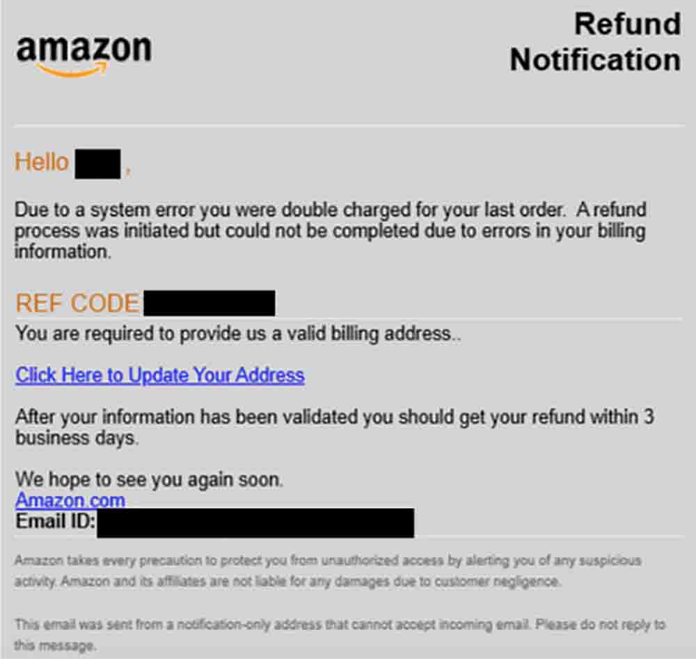En una investigación reciente, Check Point Research descubrió una campaña de phishing que suplantaba la identidad de Amazon. Un correo electrónico engañoso llevaba el asunto “Reembolso – Error del Sistema de Amazon” y parecía provenir directamente del equipo de soporte oficial de Amazon. El mensaje instaba a los destinatarios a “actualizar su dirección” haciendo clic en un enlace, aparentemente rutinario, pero totalmente fraudulento.